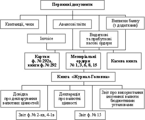 Облік наявності та руху грошових коштів в іноземних валютах на валютному рахунку в банку ведеться на активному субрахунку № 318 «Поточні рахунки в іноземній валюті», підставою для записів у якому є виписки банків з валютних рахунків установи. Операції з руху коштів загального фонду державного бюджету в іноземній валюті оформлюються окремими меморіальними ордерами за видами валют – меморіальний ордер № 2, ф. № 381. Операції з руху коштів спеціального фонду в іноземній валюті оформлюються в меморіальному ордері № 3, ф. № 382. Аналітичний облік операцій за кожною валютою ведеться на картках ф. № 292а або у книгах ф. № 292. Облік готівкової валюти в касі ведеться на активному субрахунку № 302 «Каса в іноземній валюті». Для аналітичного обліку наявності та руху валютної готівки відкривається окрема касова книга, в якій ведеться облік за кожною валютою окремо. Меморіальні ордери № 1, ф. № 380 за касовими операціями стосовно кожного виду валюти складаються окремо. Бухгалтерський облік операцій в іноземній валюті відображається в регістрах бухгалтерського обліку в національній валюті України перерахунком суми іноземної валюти за валютним курсом з одночасним відображенням операцій у іноземній валюті. Перерахування операцій, виконаних у іноземній валюті в національну валюту України, проводиться на дату здійснення операції. Сума авансу (попередньої оплати) в іноземній валюті, надана іншій установі чи одержана від інших осіб, перераховується в національну валюту України з застосуванням валютного курсу на дату одержання авансу чи попередньої оплати (рис 3.1).