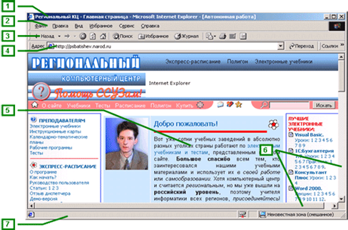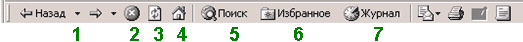 Рис. 2.1.1. Окнопрограммы Internet Explorer. Панель инструментов (Рис. 2.1.2.) : 1. Назад и Вперед – позволяют перемещаться по просмотренным страницам (на клавиатуре Alt и ¬, Alt и ® соответственно). 2. Остановить – прерывает загрузку страницы (на клавиатуре Escape). 3. Обновить – позволяет загрузить страницу заново (на клавиатуре клавиша F5). 4. Домой – переход на домашнюю (начальную) страницу. 5. Поиск – открывает панель для облегчения поиска нужной информации в Internet. 6. Избранное – открывает панель для работы с избранными ссылками. Журнал – открывает панель журнала посещения страниц.