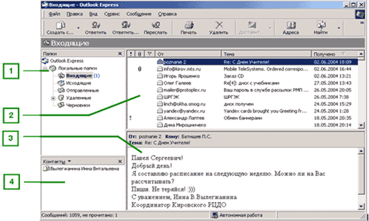 Рис. 2.2.1. Окно программы Outlook Express. Структура окна: 1. Панель папок – здесь отображаются все имеющиеся папки сообщений в виде древовидной структуры. Чтобы выбрать папку, нужно щелкнуть по ее названию. Если имя папки выведено жирным шрифтом, значит, в папке имеются непрочитанные сообщения, их количество указано в скобочках. Общее количество сообщений в папке отображается в строке состояния. 2. Список сообщений – отображается содержимое текущей папки. Список сообщений имеет столбы (графы), отображение которых можно регулировать в окне: Вид Столбцы. Выбор сообщения – щелчок мышью по строке (либо клавишами стрелками ), открыть сообщение – двойной щелчок или клавиша Enter. 3. Область просмотра – отображается заголовок и содержимое текущего сообщения. В этом окне нельзя редактировать сообщение. 4. Контакты – выводится содержимое адресной книги. При отправке сообщения адресат может быть автоматически занесен в список контактов. Все перечисленные элементы окна можно как отобразить, так и убрать с экрана путем снятия или установки флажков в окне: Вид Раскладка. Здесь же можно настроить состав кнопок панели инструментов. Папки в программе используются для хранения электронных сообщений. Предусмотрено два типа папок: стандартные– это папки, предусмотренные в программе для ее правильной работы (такие папки невозможно удалить),и пользователя – это папки, создаваемые пользователем для группировки сообщений. В программе предусмотрены следующие стандартные папки: Черновики – здесь хранятся сообщения, которые еще не готовы к отправке (недописанные) либо срок их отправки еще не подошел, Исходящие – содержит сообщения, готовые к отправке. Эти сообщения будут отправлены как только будет установлено соединение с Internet (с почтовым сервером). Отправленные – содержит отправленные сообщения. Эта папка выполняет функцию архива сообщений. Входящие – в эту папку заносятся полученные сообщения. Удаленные – в эту папку помещаются сообщения, удаленные в других папках. При удалении сообщения из папки Удаленные, оно удаляется безвозвратно. Для систематизации электронных сообщений пользователь может создать свои дополнительные папки: Файл Создать Папка Введите название папки Выделите папку, внутри которой будет создана новая папка Ok. Например, на рисунке 2.2.2. показано, что папка под названием Спам будет создана в папке Входящие. В эту папку можно будет помещать незатребованные сообщения.