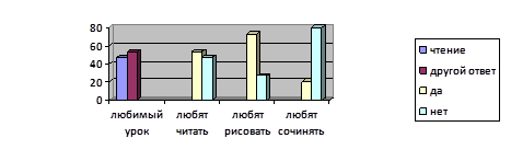 Также использовался тест на изучение оригинальности решения задач на воображение. Подготовка исследования. Подбирались альбомные листы на каждого ребенка с нарисованными на них фигурами: контурное изображение частей предметов, например, ствол с одной веткой, кружок - голова с двумя ушами и т.д., и простые геометрические фигуры (круг, квадрат, треугольник и т.д.). Подготавливались цветные карандаши, фломастеры. Проведение исследования. Ребенка 7-8 лет просили дорисовать каждую из фигур так, чтобы получилась какая-нибудь картинка. Предварительно проводилась вступительная беседа об умении фантазировать (вспомнить, на что бывают, похожи облака на небе и т.д.). Обработка данных. Выявлялась степень оригинальности, необычности изображения. Устанавливался тип решения задач на воображение. Нулевой тип. Характеризуется тем, что ребенок еще не принимает задачу на построение образа воображения с использованием данного элемента. Он не дорисовывает его, а рисует рядом что-то свое (свободное фантазирование). Первый тип. Ребенок дорисовывает фигуру на карточке так, что получается изображение отдельного объекта (дерево), но изображение контурное, схематичное, лишенное деталей. Второй тип. Также изображается отдельный объект, но с разнообразными деталями. Третий тип. Изображая отдельный объект, ребенок уже включает его в какой-нибудь воображаемый сюжет (не просто девочка, а девочка, делающая зарядку). Четвертый тип. Ребенок изображает несколько объектов по воображаемому сюжету (девочка гуляет с собакой). Пятый тип. Заданная фигура используется качественно по новому. Если в 1-4 типах она выступает как основная часть картинки, которую рисовал ребенок (кружок - голова и т.д.), то теперь фигура включается как один из второстепенных элементов для создания образа воображения (треугольник уже не крыша дома, а грифель карандаша, которым мальчик рисует картину). Коэффициент оригинальности находился по следующей формуле: Коэффициент оригинальности = сумма типов / количество детей. Таким образом, выясняется уровень оригинальности всего класса в целом, а не каждого учащегося. [6, с.31] В исследуемой группе на констатирующем этапе он равнялся двум, много это или мало можно узнать только после проведения следующих этапов эксперимента и обобщения результатов. На основе изученных теоретических подходов передовых трудов педагогов и психологов к решению проблемы повышения интереса к урокам чтения у младших школьников, было сделано предположение о том, что творческие способности, которые ребёнок может применить на уроке, способствуют повышению интереса к данному предмету. Но для того чтобы развивались творческие способности, необходимо наличие на уроке приёмов их развития. С целью апробации таких приёмов в 1 "б" классе проводился формирующий эксперимент. Суть его заключалась в том, что явления и процессы изучались в строго контролируемых условиях. В процедуре исследования проводились уроки чтения в соответствии с календарно-тематическим планом учителя, на каждом уроке детям предлагались различные творческие задания. В таком случае был изменен один фактор при неизменности и контролируемости других. Даты, темы и соответствующие им творческие задания отражены в календарном плане эксперимента. Эксперимент проводился на определённом отрезке времени. Так ж