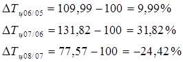 Представим расчеты в виде таблицы Таблица 4. Динамика объемов размещения и доразмещения ГКО-ОФЗ по номиналу с 2005 по 2008 гг.