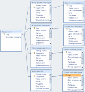 Рисунок 3.2 – ER-діаграма сутностей «Жанри літератури» і «Картки читачів» Аналізуючи наведені ER-моделі, можна описати характеристику зв’язків предметної області „Бібліотека” і побудувати результуючу ER-модель. Таблиця 3.1 - Характеристика зв’язків предметної області