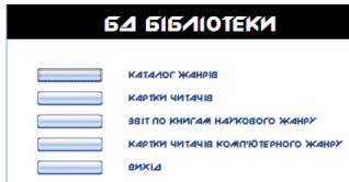 Рисунок 5.6 –“Кнопкова форма” Форма 2 «Жанри літератури». Ця форма є структурною для головної форми СУБД, яка зображена на рисунку 5.7.