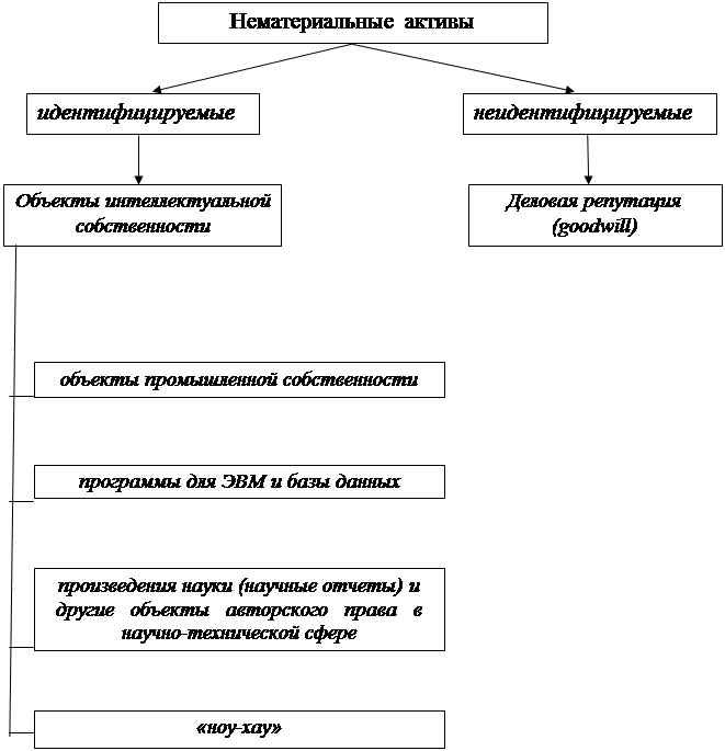 Рис.1 – Виды нематериальных активов В бухгалтерском понимании гудвилл (goodwill) представляет собой ценность фирмы, определяемую ее клиентурой, репутацией, то есть условную стоимость фирмы, ее цену. Стоимость приобретенной деловой репутации определяется расчетным путем как разница между покупной ценой, уплачиваемой продавцу при приобретении предприятия как имущественного комплекса (в целом или его части), и суммой всех активов и обязательств по бухгалтерскому балансу на дату его покупки (приобретения). В некотором смысле символ деловой репутации (гудвилл) - это товарный знак. Обычно под деловой репутацией понимают положительную оценку юридического лица другими участниками имущественного оборота. По мере добросовестного использования, рекламирования и т.д. стоимость этой связки (товарный знак плюс репутация) постоянно растет. Очень важно при этом, что речь идет не просто о товарном знаке, а именно о его связке с деловой репутацией. Цена фирмы (превышение покупной стоимости организации над его балансовой стоимостью) должна быть учтена в балансе покупателя по счету 04 « нематериальные активы» и погашаться амортизационными отчислениями в течение 20 лет, если невозможно установить более точный срок погашения ее стоимости, но не более срока деятельности организации. Рассмотрим пример: покупная цена фирмы установлена в сумме 9 000 000 рублей, а стоимость активов по балансу составляет: •основные средства - 7 000 000 руб. •сырье, материалы и др. аналогичные ценности - 600 000 руб. •животные на выращивании и откорме - 500 000 руб. •затраты в незавершенном производстве - 400 000 руб. •ВСЕГО - 8 500 000 руб. Отсюда, цена фирмы, то есть превышение покупной стоимости организации над ее балансовой стоимостью, составляет 500 000 руб. ( 9 000 000 – 8 500 000 руб.). Товарный знак – обозначение, служащее для индивидуализации товаров, выполняемых работ или оказываемых услуг юридических или физических лиц. Неким коммерческим эквивалентом репутации, в отличие от товарного знака, является брэнд. Брэнд - различающее название и/или символ, предназначенный для идентификации товара или услуги, или одного продавца или группы продавцов, и для дифференциации этих товара или услуги от аналогичных товаров конкурентов. Таким образом, брэнд сообщает клиенту о происхождении продукта и защищает клиента и производителя от конкурентов, которые пытались бы поставлять продукты, кажущиеся идентичные. Таким образом, нематериальные активы в бухгалтерском смысле - это, прежде всего, идентифицируемые нематериальные активы, а идентифицируемые нематериальные активы - это, прежде всего, объекты интеллектуальной собственности. В статье 138 ГК РФ понятие интеллектуальная собственность используется для обозначения исключительных прав гражданина или юридического лица на результаты интеллектуальной деятельности и приравненные к ним средства индивидуализации. Конкретное содержание исключительных прав определяется специальными законами, к числу которых относятся патентный закон, закон об авторском праве и смежных правах, закон о товарных знаках и т.д. Объекты интеллектуальной собственности - охраноспособные результаты интеллектуальной деятельности и средства индивидуализации в том числе: •объекты промышленной собственности (изобретения, полезные модели, промышленные образцы), на которые выда
