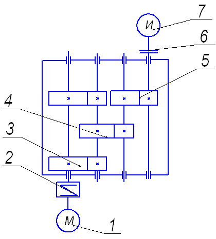 Рис. 1.1. Схема привода. Данный привод состоит из: 1- двигатель 2- муфта МУВП 3- шевронная цилиндрическая передача 4- косозубая цилиндрическая передача 5- прямозубая цилиндрическая передача 6- зубчатая муфта 7- рабочий орган Технические характеристики привода: - мощность на рабочем органе привода Pвых =13кВт - частота вращения вала двигателя nдв =1000об/мин - передаточное число редуктора i=46 2. Определение мощности электродвигателя и его выбор В данном разделе производится выбор эл/двигателя. Мощность привода определяется по формуле: