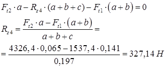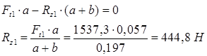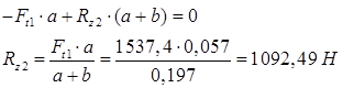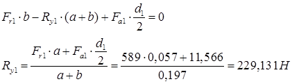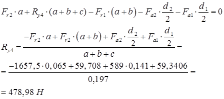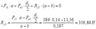 Промежуточный вал Силы в зацеплении Ft1=1537,36 H Fr1=589 H Fa1=499,51 H Ft2 =4326,4 H Fr2 =1657,5 H Fa2 =1405,73 H Расчётные расстояния а=0,065; в=0,076; c=0,056. Рассмотрим плоскость ХОY (рисунок 2). Определим опорные реакции: