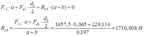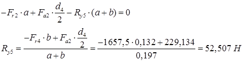 Тихоходный вал Силы в зацеплении Ft2= 4326,4 H Fr2= 1657,5 H Fa2= 1405,73 H Расчётные расстояния а=0,065; b=0,132 Рассмотрим горизонтальную плоскость ХОY (рисунок 3). Определим опорные реакции: