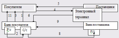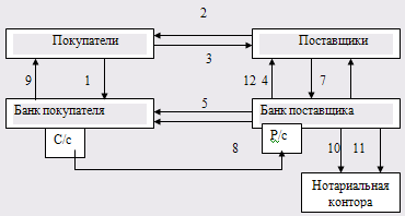 Рисунок 2 – Схема расчетов аккредитивами. Поставщик в срок не позднее десять дней с момента получения чека предоставляет его вместе с реестром в свой обслуживающий банк (7). Эта операция считается предъявлением чека к оплате. Тот в свою очередь пересылает чек с реестром в банк покупателя (8). Банк покупателя перечисляет деньги (9). После этого делаются выписки банков своим клиентам (10) и (11). В бухгалтерском учете покупателя выполняются проводки.