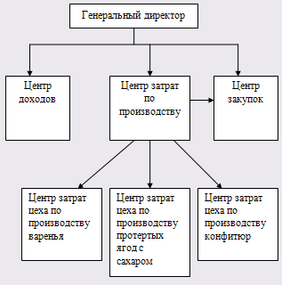 Должностные обязанности сотрудников предприятия. Генеральный директор: - организует всю работу предприятия и несет полную ответственность за его состояние и деятельность перед учредителями (собственниками предприятия) и трудовым коллективом; - представляет предприятие во всех учреждениях и организациях; - распоряжается имуществом предприятия, заключает договора, издает приказы по предприятию; - в соответствии с трудовым законодательством принимает и увольняет работников, применяет меры поощрения и налагает взыскания на работников предприятия; - открывает в банках счета предприятия. Бухгалтерия: - учет средств предприятия и хозяйственных операций; - установление результатов финансово-хозяйственной деятельности предприятия; - планирование и экономическому стимулирование на предприятии, повышение производительности труда, выявление и использование производственных резервов по улучшению организации производства, труда и заработной платы, организация хозрасчета и др.; - контроль за соблюдением законодательства в сфере бухгалтерского учета, составляет отчет по деятельности предприятия за текущий период. Юридический отдел: - представление интересов предприятия в арбитражных судах; - предоставление юридических консультаций; - контроль за соблюдением гражданского кодекса РФ; - урегулирование различных претензий. Директор по персоналу: - анализ текучести кадров; - отбор кандидатов для приема на работу; - подготовка, переподготовка и повышение квалификации кадров; - составление штатного расписания. Директор по социально-бытовым вопросам: - организация уборки и охраны предприятия; - хранение ключей от всех помещений предприятия; - организация мелкого инвентаря и канцелярских товаров; - бесперебойное оснащение предприятия водой и электроэнергией. Директор по производству: - контроль за выполнением плана по производству продукции; - контроль за своевременным снабжением сырьем и материалами; - контроль за обеспеченностью рабочей силы; - разработка предложений по снижению издержек, увеличению объема выпуска продукции и новых технологий. Отдел рекламы и маркетинга: - анализ рынка, планирование и прогнозирование; - разработка и проведение рекламных компаний, акций; - анализ конкурентов; - поиск новых рынков сбыта; - дизайн упаковки. Директор по продажам: - организация контакта с покупателем; - поиск новых покупателей; - заключение сделок. Менеджер по продажам: - работа с конкретным покупателем. Основные рабочие: - непосредственно производство продукции. Начальник цеха: - организация производства продукции; - организация условий для производства; - разработка предложений по совершенствованию технологии производства и увеличению производительности труда. Отдел снабжения: - своевременное обеспечение производства необходимым сырьем и материалами; - заключение договоров с поставщиками (организация работы); - поиск новых поставщиков; Уборщица: - своевременная уборка предприятия; - полив комнатных растений. Охрана: - непосредственно охрана предприятия. Выделение центров ответственности на предприятии "Ягодка". Центр ответственности – это часть организации, выделяемая в учете для контроля за ее деятельностью. Целью учета по центрам ответственности является удовлетворение информационных потребностей внутреннего управления. Он 