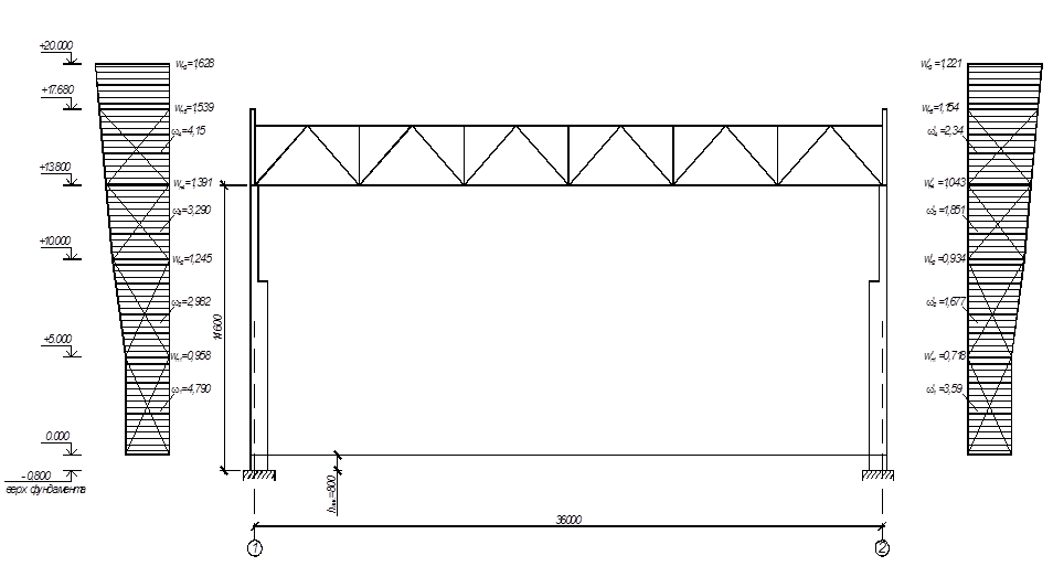 Рисунок 15 – Схема к расчету на ветровую нагрузку Для заданного типа местности В с учетом коэффициента k из таблицы 6 /3/ получаем следующее значение ветрового давления по высоте здания: - на высоте до 5 м - на высоте 10 м - на высоте 20 м Согласно рисунку 15, вычислим значения нормативного давления на отметках верха колонн и верха панели: - на отметке 13,80: