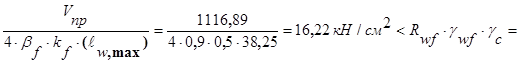 Расчетное сечение – является сечение по металлу сварного шва. Проверяем условие прочности: