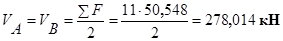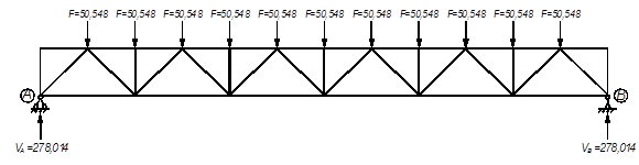 Рисунок 2 – Расчетная схема при расчете стропильной фермы на постоянную нагрузку Опорные реакции стропильной фермы от постоянной нагрузки, находятся следующим образом: