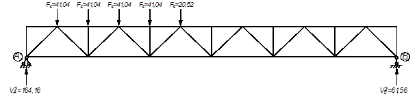 Рисунок 3 – Расчетная схема при расчете стропильной фермы на I вариант снеговой нагрузки Опорные реакции стропильной фермы от I варианта снеговой нагрузки, находятся следующим образом: