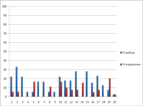 Рисунок 2.3 Диаграмма общих показателей социометрии По итогам анализа результатов социометрии, проведенной в группах «риска» и «благополучных» отдельно 4 испытуемых имеют высокий, 7 - средний, 5 - низкий и 4 - отрицательный итоговый показатель. Процентные показатели выбора и отвержения представлены в рисунке 2.3 и рисунке 2.4. Среднее арифметическое значение выбора в группах отдельно, по отношению к среднему арифметическому значению в общей группе, увеличился на 4. Вместе с тем среднее арифметическое отвержения уменьшился на 2.