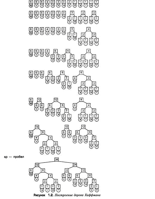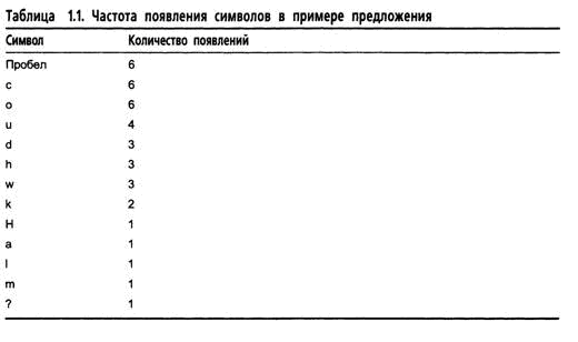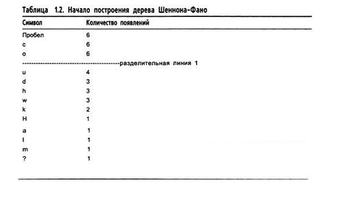 Теперь разделим таблицу на две части, чтобы общее число появлений символов в верхней половине таблицы приблизительно равнялось общему числу появлений в нижней половине. Предложение содержит 38 символов, следовательно, верхняя половина таблицы должна отражать приблизительно 19 появлений символов. Это просто: достаточно поместить разделительную линию между строкой o и строкой u. В результате этого верхняя половина таблицы будет отражать появление 18 символов, а нижняя - 20. Таким образом, мы получаем таблицу 1.2.