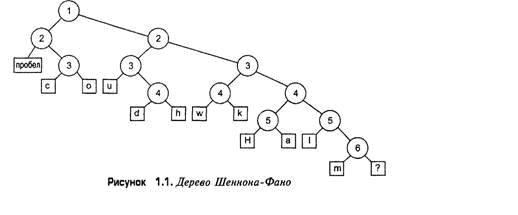 Теперь проделаем то же с каждой из частей таблицы: вставим линию между строками так, чтобы разделить каждую из частей. Продолжим этот процесс, пока все буквы не окажутся разделенными одна от другой. Результирующее дерево Шеннона-Фано представлено в таблице 1.3.