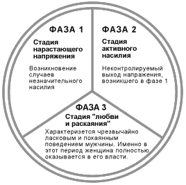 Насилие обычно стандартно. Цикл насилия имеет три фазы: 1. Напряжение - отдельные вспышки оскорблений. Женщины обычно реагируют спокойно, стараясь разрядить обстановку или пытаются защитить свое положение в семье. Оба партнера могут оправдывать поведение мужчины его реакцией на стресс из-за работы, денег и т.д. С ростом напряжения способности женщины балансировать становятся все слабее. Именно на этой стадии для женщин наиболее необходимо и эффективно найти поддержку и помощь. 2. Острое насилие - всплеск напряжения в самой негативной форме. Припадки гнева настолько сильны, что обидчик не может отрицать их существование, а женщина не может отвергать, что они имеют на нее сильное влияние. Однако женщина обычно заранее чувствует приближение такой ситуации, и с ее приближением растут страх и депрессия. Но тем не менее острое насилие существует потому, что мужчина выбирает насильственный способ отношений. После этого обычно наступает отрицание серьезности инцидента, обращения в милицию, за медицинской помощью. На этой стадии женщине необходимо помочь осознать, что предугадываемого, ожидаемого акта насилия можно и нужно избежать-уйти из дома, укрыться, позвать на помощь друзей. 3. "Медовый месяц" В этом периоде мужчина может быть добрым, любящим, виноватым, обещать никогда не повторять насилие или, наоборот, обвинять женщину в том, что это она спровоцировала насилие. В этот период женщина счастлива, верит, что этот человек изменится. Это время, когда женщине труднее всего уйти, но необходимо помнить, что, однажды случившись, насилие, скорее всего, будет продолжаться с постепенным усилением. Люди, живущие в ситуации насилия и являющиеся пострадавшей стороной, могут испытывать следующие чувства: · ужас · сверхбдительность · смятение · чувство беспомощности, безнадежности или бессилия · беспокойство о безопасности · чувство вины · чувство подавленности · кошмары по ночам · потеря уверенности в себе · навязчивые воспоминания · приступы тревоги · депрессия · фобии · печаль · мысли о самоубийстве · самообвинения · потеря веры · духовные сомнения · отказ от участия в церковной жизни, в жизни общества, семьи · прекращение духовной практики · изменения сексуальной активности · алкогольная/наркотическая зависимость · желание возмездия Механизмы поведения женщин, подвергающихся избиениям 1. Детство женщин, подвергающихся избиениям: Может быть, насилие было обычным делом в семье, в которой она выросла: отец бил мать, братья и сестры били друг друга. Дети оскорбляют тех, кого оскорбляют в семье 2. Экономическая зависимость: Экономическая безопасность для себя и своих детей, ограниченная помощь со стороны государства; не может заработать столько же, сколько и мужчина: тот, кто избивает, контролирует деньги Страхи женщин, подвергающихся насилию: · Не существует способа защитить себя, даже в том случае, если придет полиция и арестует его. Женщина уверена: если донесет на него, то он отомстит ей или причинит вред тому, кто ей дорог, или чему-нибудь, что является ценным для нее (детям, домашним животным и т.д.). Она приносит себя в жертву ради спокойной жизни других. · Если она донесет на него, то муж потеряет работу · Никто ей не поверит · Может потерять своих детей, так как суд решит, что она не смогла остановить насилие в семье или суд передаст опеку н