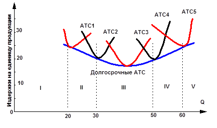 Рис. 5. Кривая долгосрочных средних издержек фирмы Кривая средних общих издержек ATC1 описывает краткосрочные средние издержки применительно для самого малого из рассматриваемых предприятий. Это значит, что если предприниматель ставит цель получить объём продукции, не превышающий 20 единиц, то он выберет именно этот вариант. Конечно, данный объём продукции мог бы быть произведён и на предприятии больших размеров, но в таком случае общие средние издержки увеличились бы, ибо выросшие производственные мощности оказались бы недоиспользованными. Значит, выбор второго варианта размера предприятия предполагает расширение объёма выпуска в параметрах между 20 и 30 единицами продукции. Подобные рассуждения можно продолжить и далее. На рис.5 кривая ATC5 описывает издержки применительно к самому большому из рассматриваемых вариантов размера предприятия с объёмом выпуска более 60 единиц. На практике существует бесконечное множество вариантов размеров предприятия. Рассмотрев совокупность краткосрочных кривых для каждого из вариантов, можно понять, как строится кривая долгосрочных средних издержек. Она является огибающей для всех возможных кривых краткосрочных средних общих издержек ATC. Кривая долгосрочных ATC показывает наименьшие издержки производства любого заданного объёма выпуска при условии, что фирма располагала необходимым временем для изменения всех своих производственных факторов.