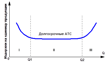 Рис.6. Динамика долгосрочных средних издержек: I - экономия от роста масштаба производства; II - постоянная отдача от роста масштаба производства; III - рост издержек в зависимости от роста масштаба производства Из рис.5 видно, что наращивание производственных мощностей предприятия будет сопровождаться снижением средних общих издержек на производство единицы продукции вплоть до достижения размеров предприятия (третий вариант). Дальнейшее наращивание объёмов производства будет сопровождаться повышением долгосрочных средних общих издержек. Динамику кривой долгосрочных средних общих издержек можно объяснить при помощи так называемого эффекта масштаба. Изменение фирмой параметров своей деятельности, переход от одного варианта размеров предприятия к другому получил в теории название изменения в масштабе производства. Реакция долгосрочных средних издержек на изменение масштаба производства может быть различной. [16, с. 160-163] 1. Если на коком-то временном интервале долгосрочные средние издержки снижаются с увеличением объёма выпуска продукции, то имеет место экономия, обусловленная ростом масштаба производства (или положительным эффектом масштаба). Например, увеличение количества применяемых ресурсов на 10 % вызвало рост объёма выпуска на 12 %. Данный период времени с объёмом выпуска OQ1 соответствует варианту I функционирования расширяющейся фирмы (рис.6). Существует ряд факторов, обусловливающих эффект экономии: а) углубление специализации труда. Сосредоточение усилий работника на всё сужающемся поле деятельности неизбежно повышает производительность его труда. Сказанное относится не только к производственным рабочим, но и к управленческому персоналу; б) неделимость производства. Всякая фирма для осуществления своей деятельности должна иметь некий минимальный объём некоторых ресурсов. Понятие неделимости здесь употреблено в том смысле; что нельзя использовать, скажем, половину этого объёма ресурсов при изменении объёма выпуска, а лишь целиком. По мере роста фирмы затраты на такие ресурсы не увеличиваются (или увеличиваются незначительно), поэтому величина их издержек на единицу продукции падает. Например, имеющийся у фирмы офис со своей "начинкой" может удовлетворять потребности фирмы на определённом этапе её роста без каких-либо количественных изменений; в) применение новых технологий. Применение в производстве различных технических нововведений требует значительных финансовых и иных затрат. Как правило, малые фирмы часто просто не в состоянии понести такие затраты. К тому же эффективность применения новой техники наиболее полно проявляет себя в условиях большого объёма производства; г) производство побочной продукции. Крупная фирма не в состоянии эффективно использовать неизбежные в производстве отходы. Их переработку осуществляют вспомогательные производства, что в конечном счёте тоже ведёт к снижению долгосрочных средних общих издержек. 2. Если на определённом временном интервале производства долгосрочные средние общие издержки при увеличении объёма выпуска растут, то имеет место ущерб от масштаба роста производства (или отрицательный эффект масштаба). Например, увеличение количества применяемых ресурсов на 10 % вызвало рост объёма выпуска на 7 %. Этот интервал с объёмом выпуска свыше ) OQ2 соответствуе