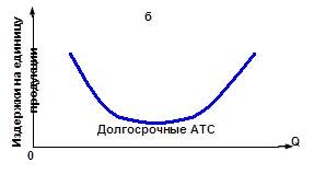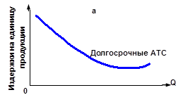 Рис. 4. Взаимосвязь общих, средних и предельных издержек производства Рассмотрим взаимосвязь общих TC, средних AVC и предельных MC издержек. Для этого дополним рис. 2 кривой предельных издержек и совместим его с рис. 1 в одной плоскости (рис. 4). Анализ конфигурации кривых позволяет сделать следующие выводы о том, что: 1) в точке а, где кривая предельных издержек достигает своего минимума, кривая общих издержек TC из состояния выпуклости переходит в состояние вогнутости. Это означает, что после точки а при одних и тех же приращениях общего продукта величина изменений общих издержек будет возрастать; 2) кривая предельных издержек пересекает кривые средних общих и средних переменных издержек в точках их минимальных значений. Чем это объяснить? Если предельные издержки меньше, чем средние общие издержки, последние уменьшаются (в расчёте на единицу продукции) (гр. 7 и 8 табл. 1). Значит на рис. 4а средние общие издержки будут падать до тех пор, пока кривая предельных издержек проходит ниже кривой средних общих издержек. Средние общие издержки будут расти там, где кривая предельных издержек проходит выше кривой средних общих издержек. То же можно сказать и по отношению к кривым предельных и средних переменных издержек MC и AVC. Что же касается кривой средних постоянных издержек AFC, то здесь такой зависимости нет, ибо кривые предельных и средних постоянных издержек не связаны друг с другом; 3) первоначально предельные издержки ниже как средних общих, так и средних издержек. Однако вследствие действия закона убывающей отдачи они превышают как те, так и другие по мере увеличения выпуска продукции. Становится очевидным, что дальше расширять производство, увеличивая только затраты труда, экономически невыгодно. Изменение цен на ресурсы и производственных технологий приводит к смещению кривых издержек. Так, рост постоянных издержек приведёт к смещению кривой FC вверх, а так как постоянные издержки AFC являются составной частью общих, то и кривая последних также сместится вверх. Что же касается кривых переменных и предельных издержек, то на них рост постоянных издержек никак не отразится. Возрастание переменных издержек (например, удорожание труда) вызовет смещение вверх кривых средних переменных, общих и предельных издержек, но никак не отразится на положении кривой постоянных издержек. [16, с. 152-155] Аналогичным образом можно рассуждать и о последствиях технологических изменений. Если таковые вызовут удешевление производственных факторов или повышение их производительности, то соответственно кривые издержек сместятся вниз. Долгосрочный период в деятельности фирмы характеризуется тем, что она в состоянии изменить количество всех используемых производственных факторов. В этот период одни фирмы могут покинуть данную отрасль, другие - войти в неё. Так как в долгосрочном периоде переменный характер всех применяемых факторов позволяет фирме использовать самые оптимальные варианты их сочетания, то это непременно отразится на величине и динамике изменения её средних издержек. Итак, фирма решила увеличить объём производства, расширить свои мощности. Что будет происходить с её средними общими ATC издержками? Скорее всего, на начальном этапе расширения производства они будут снижаться, а затем, когда в производство будут вовлекаться всё новые и новые мо