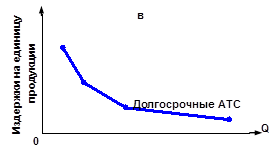 Рис. 7. Типы кривых долгосрочных ATC 3. Если же в течении определённого времени производства долгосрочные средние общие издержки никак не реагируют на изменение объёма выпуска, т.е. остаются неизменными, то фирма будет иметь постоянный эффект от изменения масштаба производства. Например, рост количества применяемых ресурсов на 10 % вызвал рост объёмов производства также на 10 %. Данный временной интервал отвечает варианту II функционирования расширяющейся фирмы (рис.6). [16, с. 178-182] Итак, суть эффекта масштаба сводится к тому, что в одних случаях расширение объёма выпуска будет сопровождаться снижением долговременных средних общих издержек, в других - их увеличением. Это обстоятельство оказывает существенное влияние на структуру той или иной отрасли. Чтобы понять это воздействие, вводится понятие минимального эффективного масштаба (MES), т.е. наименьшего объёма производства, при котором фирма может минимизировать свои долгосрочные средние общие издержки. На рис.6 видно, что это возможно при объёме выпуска, равном OQ1 . Выбор оптимального размера предприятия будет зависеть от того, какая ситуация складывается с долгосрочными средними общими издержками. Если наблюдается тенденция снижения последних с увеличением объёма выпуска и если этот временной интервал достаточно продолжителен (рис.7, а), то наибольшую эффективность продемонстрируют крупные фирмы, ибо они обладают возможностью наиболее полно использовать последствия положительного эффекта масштаба. Если же положительный эффект масштаба по временной продолжительности является относительно небольшим (рис.7, б) и быстро сменяется отрицательным эффектом, то эффективнее других будут выглядеть небольшие фирмы, ибо они в состоянии оперативно вносить необходимые коррективы в свою хозяйственную политику. Значителен удельный вес производства малых фирм в сельскохозяйственной отрасли, сфере услуг и некоторых отраслях лёгкой промышленности. В случае достаточной продолжительности временного интервала с постоянной отдачей от применяемых производственных факторов, когда положительный эффект масштаба уже себя исчерпал, а отрицательный не вступает в действие до тех пор, пока не достигнуты значительные объёмы производства, одинаково эффективными окажутся и крупные и небольшие фирмы. На рис.6 показана эта ситуация на том отрезке кривой долгосрочных средних издержек, который описывает объём производства, равный Q1 Q2 . Нельзя полагать, что во всех случаях расширение объёмов выпуска будет сопровождаться чётко прослеживаемой сменой названных временных интервалов. Хозяйственный опыт показывает, что для некоторых отраслей (например, для обрабатывающей) типична относительная продолжительность положительного эффекта масштаба при условии больших объёмов выпуска (рис.7, в). Из рис.7, в видно, что кривая долгосрочных ATC сначала стремительно падает, затем темп падения замедляется и она плавно снижается с увеличением объёма выпуска. Средние издержки приближаются к постоянным. Такие кривые называются ещё L-образными кривыми. Для эффективного управления расходами предприятия целесообразно воспользоваться соответствующей их классификацией. Эта классификация может быть использована в процессе учета, анализа, планирования и контроля расходов предприятия и проводится по следующим основны