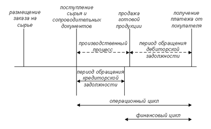 Рис. 12. Этапы обращения денежных средств Логика представленной схемы заключается в следующем. Операционный цикл характеризует общее время, в течение которого финансовые ресурсы омертвлены в запасах и дебиторской задолженности. Поскольку предприятие оплачивает счета поставщиков с временным лагом, время, в течение которого денежные средства отвлечены из оборота, т. е. финансовый цикл, меньше на среднее время обращения кредиторской задолженности. Сокращение операционного и финансового циклов в динамике рассматривается как положительная тенденция. Если сокращение операционного цикла может быть сделано за счет ускорения производственного процесса и оборачиваемости дебиторской задолженности, то финансовый цикл может быть сокращен как за счет данных факторов, так и за счет некоторого некритического замедления оборачиваемости кредиторской задолженности. Таким образом, продолжительность финансового цикла (ПФЦ) в днях оборота рассчитывается по формуле ПФЦ=ПОЦВОК=ВОЗ+ВОДВОК