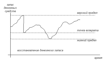 Рис. 14. Модель Миллера – Орра Логика действий финансового менеджера по управлению остатком средств на расчетном счете представлена на рис. 14 и заключается в следующем. Остаток средств на счете хаотически меняется до тех пор, пока не достигает верхнего предела. Как только это происходит, предприятие начинает покупать достаточное количество ценных бумаг с целью вернуть запас денежных средств к некоторому нормальному уровню (точке возврата). Если запас денежных средств достигает нижнего предела, то в этом случае предприятие продает свои ценные бумаги и таким образом пополняет запас денежных средств до нормального предела. ЗАКЛЮЧЕНИЕОборотные средства фонд денежных средств предприятия, авансированный в оборотные производственные фонды и фонды обращения для обеспечения непрерывности производства. Постоянный оборотный капитал – та часть текущих активов, потребность в которых относительно постоянна в течение всего операционного цикла. Переменный оборотный капитал – та часть, текущих активов, потребность в которых возникает лишь в пиковые моменты операционного цикла. Текущие обязательства – задолженность, период погашения которой не превышает одного года. Чистый оборотный капитал – показатель, характеризующий соотношение между текущими активами и обязательствами и численно равный разнице между ними. Существуют два источника формирования оборотных средств: собственные и привлеченные. Посредством нормирования определяется общая потребность предприятия в оборотных средствах. Норма оборотных средств – величина, соответствующая минимальному, экономически обоснованному объему запасов. Она устанавливается, как правило, в днях. Норматив оборотных средств – минимально необходимая сумма денежных средств, обеспечивающих непрерывность работы предприятия. Показателями эффективности использования оборотных средств являются длительность одного оборота, коэффициент оборачиваемости (показывает количество оборотов, совершаемых за определенный период), коэффициент загрузки оборотных средств (характеризует величину оборотных средств, приходящихся на 1 руб. реализованной продукции). Основными характеристиками оборотных средств являются их ликвидность, объем и структура. Величина оборотных средств определяется не только потребностями производственного процесса, но и случайными факторами. Поэтому принято подразделять оборотный капитал на постоянный и переменный. Постоянный оборотный капитал представляет собой ту часть денежных средств, дебиторской задолженности и производственных запасов, потребность в которых относительно постоянна в течение всего операционного цикла. Категория переменного оборотного капитала (или варьирующей части текущих активов) отражает дополнительные текущие активы, необходимые в пиковые периоды или в качестве страхового запаса. Политика управления оборотным капиталом должна обеспечить поиск компромисса между риском потери ликвидности и эффективностью работы. В теории финансового менеджмента принято выделять различные стратегии финансирования текущих активов в зависимости от отношения менеджера к выбору источников покрытия варьирующей их части. Самые распространенные из них: идеальная; агрессивная; консервативная; компромиссная. Одной из основных составляющих оборотно