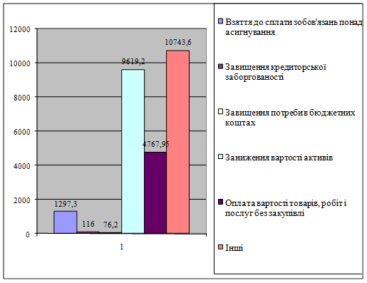 Рис. 2.4. Структура фінансових поршень, виявлених органами ДКРС протягом 2008 року. Неприйнятною також є ситуація, коли відшкодування незаконних, нецільових витрат та недостач забезпечується на рівні 42 відсотків. Найнижчий рівень відшкодування таких порушень забезпечено КРУ в Донецькій області — 20,6% , КРУ в Харківській області — 25,6% та КРУ в Черкаській області — 38,8 відсотка. Окремі Управління не забезпечили навіть відшкодування «інших» порушень, хоча вони повинні усуватися вже під час ревізії. КРУ в Донецькій області забезпечило усунення таких порушень на рівні лише 16,4%, а КРУ в Запорізькій області — 27,8 відсотка. Основна причина низького рівня усунення порушень — це проблеми, що виникають у процесі реалізації матеріалів контрольних заходів, незастосування заходів впливу до порушників фінансової дисципліни та неналежний рівень правової роботи в окремих Управліннях. Проте на заваді стають також упущення на стадії виявлення й документування порушень. Окремі Управління «згортають» цю роботу. Зменшення обсягів виявлених незаконних, нецільових витрат та недостач спостерігаються по КРУ в Кіровоградській області —- на 77%. КРУ в Київській області — на 61,3%. КРУ в м. Києві — на 37,7%. Знизилась активність роботи з виявлення недоотриманих фінансових ресурсів по КРУ в м. Севастополі — на 60.1 % та КРУ в Сумській області — на 40,5 відсотка. Не було звернено належної уваги на виявлення фактів втрат фінансових І матеріальних ресурсів, допущених в результаті неефективних управлінських дій, КРУ в м. Севастополі (встановлено 4,2 млн. грн.), КРУ в Тернопільській області (4,9 млн. грн.), КРУ в Закарпатській області (6,4 млн. гривень). Залишається високим рівень без-результативних контрольних заходів, які проводяться КРУ за власною ініціативою. Чверть таких контрольних заходів у четвертому кварталі завершено безрезультатно (4 ревізії) чи виявились малорезультативними (484 ревізій), lieнасамперед стосується КРУ у Волинській, Донецькій, Львівській, Тернопільській, Харківській, Хмельницькій областях та м. Києві, контрольні заходи яких завершено з «результатом» у межах 10 тис. грн. втрат. Низька результативність окремих контрольних заходів здебільшого є наслідком упущень, які мали місце під час відбору об'єктів проведення ревізій. Наприклад, із 8-ми об'єктів контролю, додатково внесених за власною ініціативою до плану контрольно-ревізійної роботи на 111 квартал 2008 року КРУ в м. Києві, ревізії 3-х об'єктів виявились малорезультативними. а одна — взагалі без результатів. Подібна ситуація склалася й по КРУ в Донецькій області. Залишається низькою якість контрольних заходів. Наприклад, ревізія Національного інституту винограду і вина «Магарач», проведена ГоловКРУ. виявила 1,6 млн. грн. порушень, пов'язаних з обліком активів, які були допущені ще у 1995-2007 роках. Проте працівники КРУ в АР Крим, неодноразово перевіряючи цей об'єкт у попередні роки, не зафіксували порушень. У діяльності Служби залишаються проблеми та недоліки щодо взаємодії з органами виконавчої влади та місцевого самоврядування, організації роботи колегій та роботи з кадрами. Комплекс проблем, не розв'язаних у процесі діяльності за визначеними ГоловКРУ пріоритетними напрямами, призвів до того, що останні місця в рейтингу за підсумками 2008 року посіли КРУ в місті Севастополі, Тернопільській та Черкаській 