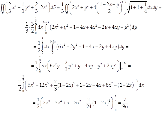 Пример. Найти поток векторного поля Решение. Проекцией данной поверхности на координатную плоскость Оху является треугольник с вершинами в точках А(0;0), В(0;1), С(½; 0). Найдем координаты единичной нормали к плоскости: