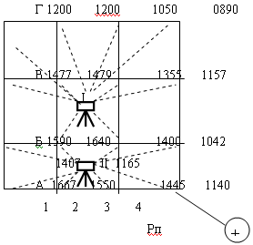 Рис. 11 Если это условие выполняется, то разницу распределяют на четыре части и откладывая расстояния закрепляют вершины Г4, В4, Б4. Аналогично разбиваются внутренние вершины. При их закреплении могут также использоваться две стальные проволоки длиной 31 м, натягиваемые по двум взаимно перпендикулярным направлениям. В точке их пересечения закрепляют положение всех внутренних вершин. При разбивке квадратов одновременно измеряется расстояние до характерных точек ситуации (до границы луча, пашни, тропинки, дороги). Площадка нивелируется с одной или нескольких стоянок инструмента. При значительном перепаде высот стоянок должно быть не меньше трех (рис. 12).
