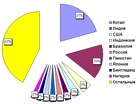 . Доклад по географии выполнен учеником 10 «Б» класса средней школы №20 Панченко Сергеем. 2001 г. На нынешнем этапе социально-экономического развития мирового сообщества по-прежнему очень важно добиться надежного обеспечения населения земного шара продуктами питания. Продовольствие постоянно выступает необходимой и безальтернативной частью фонда жизненных средств, и нарастание по тем или иным причинам его дефицита справедливо воспринимается как бедствие, требующее быстрых действий. Закономерно, что продовольственная проблема имеет давние исторические корни и при своем обострении неизбежно порождала на всех континентах серьезную угрозу здоровью и самому существованию их жителей, а также нормальному функционированию хозяйственного механизма. Она приобрела ныне глобальную значимость по причинам гуманистического свойства и в силу целостности современного мира, где еще широко сохраняются голод и недоедание, борьба с которыми взаимосвязана со столь же нелегкой и актуальной задачей преодоления экономической отсталости бывших колоний и зависимых территорий. Основополагающей причиной масштабных продовольственных трудностей, наблюдаемых на протяжении последних десятилетий, стали именно структурные внутренние диспропорции в национальных системах продовольственного обеспечения в развивающихся странах. Отсюда в итоге наличие «ножниц» между рыночным спросом и предложением на главные продукты питания. Весомая роль в данном процессе принадлежит урбанизации. Именно она в первую очередь определяет формирование новых стандартов продовольственного потребления и вызывает сдвиги в структуре питания в пользу «интернациональных» продуктов. Международное звучание продовольственной проблеме придает и то обстоятельство, что ее прочного решения невозможно достичь изолированными усилиями отдельных стран, от которых требуется хорошо налаженное сотрудничество вне зависимости от господствующих в них общественных и политических систем. К ней нельзя подходить также в отрыве от других сложных ситуаций глобального размаха, с которыми вынуждено сталкиваться человечество. В настоящее время в мире, видимо, нет государства, в котором производство, распределение и внешняя торговля продовольствием не были бы серьезной заботой центральных властей. И в этом отношении рассматриваемая проблема тоже выступает поистине планетарной, несмотря на то, что одни страны сталкиваются с хроническим недостатком продуктов питания, в других текущей целью стало качественное улучшение пищевого рациона с тем, чтобы приблизить его к научно обоснованным нормам, а некоторые вынуждены даже «бороться» с излишками производимых продуктов и вызываемыми их избыточным потреблением болезнями населения. Население крупнейших стран мира. (население Земли в целом – около 6 млрд. чел.)