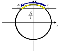 Для того чтобы выбрать число, соответствующее второму концу выделенной дуги, «пройдем» по этой дуге из названного конца к другому. При этом напомним, что при движении против часовой стрелки числа, которые мы будем проходить, увеличиваются (при движении в противоположном направлении числа уменьшались бы). Запишем число, которое изображается на единичной окружности вторым концом отмеченной дуги Таким образом, мы видим, что неравенству Фрагмент урока направленный на формирование умений решать тригонометрические неравенства Решим тригонометрическое неравенство