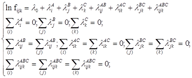 де ln(nijk ) – очікувана частота чарунка (і, j, k) тривимірної таблиці спряженості, обчислена за умови незалежності змінних A, B, C; параметри λ визначають внесок у логарифм очікуваної частоти змінних як окремо , так і внаслідок їхньої взаємодії. Параметри λ логлінійної моделі задовольняють умовам: