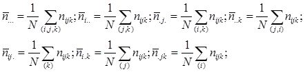 де fijk ,λ – невідомі параметри, які називаються: λi A – ефект i-ого рівня ознаки А, i=1,..,I; λj B - ефект j -ого рівня ознаки B, j=1,..,J; λk C - ефект k-ого рівня ознаки C, k=1,..,K; λij AB – ефект взаємодії i-ого рівня ознаки А та j -ого рівня ознаки B; λik AC – ефект взаємодії i-ого рівня ознаки А та k-ого рівня ознаки C; λjk BC - ефект взаємодії j -ого рівня ознаки B та k-ого рівня ознаки C; λijk ABC – ефект взаємодії i-ого рівня ознаки А, j -ого рівня ознаки B та k-ого рівня ознаки C; fijk - гіпотетична частота в (i,j,k)-ій комірці Оцінки параметрів знаходяться за методом максимальної правдоподібності й набувають вигляду: