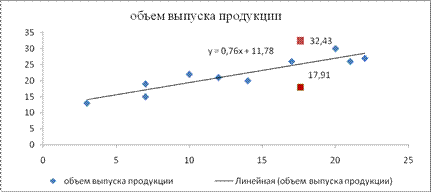 таким образом, прогнозное значение будет находиться между: Yпрогн(80 % max ) += 25,17+7,26=32,43 – верхняя граница прогноза, Yпрогн(80 % max ) – =25,17–7,26=17,91 – нижняя граница прогноза. 7. Графическое представление (рис. 3) модели парной регрессии зависимости объема выпуска продукции от объема капиталовложений: фактические и модельные значения