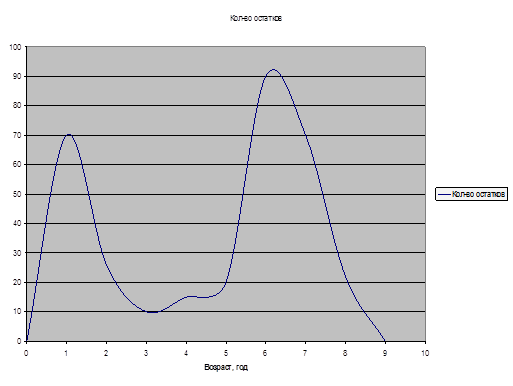 Решение: Среднее время генерации – демографический показатель популяции, означающий средний возраст, в котором самки производят потомство. Непосредственно влияет на скорость роста или скорость сокращения численности популяции. Среднее время генерации – 17,5 лет. Задача 3. Построить кривую выживания по данным определения возраста остатков животных. Определить среднее время генерации.