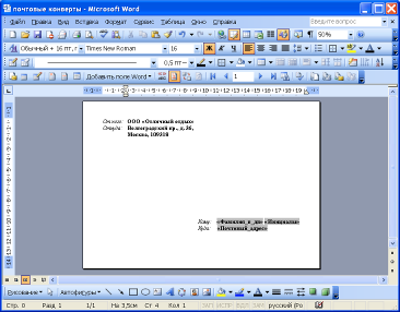 Итак, постоянной информацией на конверте будет информация об отправителе, которую необходимо напечатать в верхней левой части основного документа. А в его нижней правой части мы добавим поля-заполнители для дальнейшей подстановки информации о каждом адресате. Так как мы готовим поздравления для граждан (а не для юридических лиц), нам необходимо (Рисунок 12): – на одной строке вставить поле «Фамилия в дательном падеже» и через пробел – поле «Инициалы» (или поле «Имя и Отчество»), – а на следующей строке добавить поле «Почтовый адрес». После этого основной документ для печати почтовых конвертов можно считать подготовленным. Теперь с помощью операции предварительного просмотра оценим, как будут выглядеть готовые почтовые конверты. Для этого нажнем на пиктограмму «Поля/данные» ( После предварительного просмотра подготовленных почтовых конвертов необходимо закончить процесс слияния, нажав на пиктограмму «Слияние в новый документ» ( Обратите внимание: подготовленный основной документ можно использовать еще много раз для печати почтовых конвертов. Для этого надо всего лишь сохранить файл перед закрытием.
