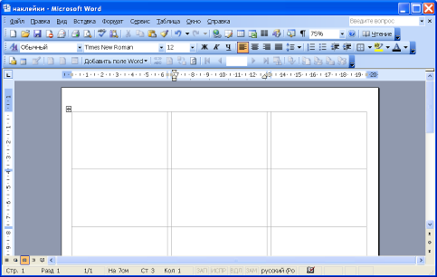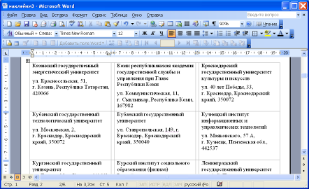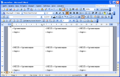 Рисунок 13 Условные обозначения: 1 – пиктограмма «Поля/данные»; 2 – пиктограмма «Затенение полей»; 3 – пиктограмма «Следующая запись». Говоря о подготовке почтовых конвертов, отметим, что почтовый адрес в источнике данных можно представлять как несколько категорий данных: «Улица, дом, квартира», «Населенный пункт», «Район, субъект РФ», «Почтовый индекс». Такое детальное разбиение почтового адреса на категории данных позволит аккуратнее оформить почтовые конверты, расположив разные реквизиты адреса на отдельных строках. При этом в основном документе поля-заполнители для адреса нужно располагать в следующей последовательности: «Улица, дом, квартира», «Населенный пункт», «Район, субъект РФ», «Почтовый индекс» А в готовых конвертах адрес будет выглядеть так: ул. Октябрьской Революции, 3а, г. Казань, Республика Татарстан, 4230000 Печатаем адреса на самоклеющихся этикеткахПри печати конвертов может возникнуть следующий вопрос. Как быть, если конверт нужен формата С4 (229 х 324 мм), а принтер позволяет печатать только формат А4 (210 х 297 мм) и ради печати почтовых конвертов покупать другой принтер никто не будет. Можно ли использовать функцию слияния в данном случае? Ответ на данный вопрос будет положительным. Мы можем использовать функцию «Слияние» для ускорения заполнения почтовых конвертов. Однако адрес при этом будем размещать не на самом конверте, а на самоклеящихся адресных этикетках, которые после печати будем наклеивать на почтовые конверты. На стандартном листе формата А4 расположено несколько самоклеющихся этикеток. Есть разные модификации, которые отличаются размером этикеток (чем они мельче, тем их больше на листе) и цветом бумаги. На одной подложке формата А4 находятся одинаковые по размеру этикетки. После того как на них нанесен адрес, каждая из этикеток легко отделяется от подложки и наклеивается на почтовый конверт. Рассмотрим, как использовать функцию «Слияние» для заполнения самоклеющихся этикеток. Сначала откроем новый основной документ и выберем в качестве его типа «Наклейки» (Рисунок 4). После этого откроется окно «Параметры наклейки» (Рисунок 14), в котором выберем тип используемых наклеек. Практически всегда информация о типе и размере этикеток нанесена на их упаковку, поэтому в данном окне необходимо выбрать тот же тип, который указан на упаковке, и нажать на кнопку «ОК». В результате в основном документе будет автоматически создана таблица с ячейками, равными по размеру самоклеющимся адресным этикеткам, а расположение ячеек таблицы будет такое же, как расположение этикеток на подложке (Рисунок 15). При этом размер ячеек указывается как точное значение[2] (а не как минимальное), поэтому границы таблицы будут постоянными и не будут автоматически сдвигаться в случае нехватки места для текста в какой-либо из ячеек.