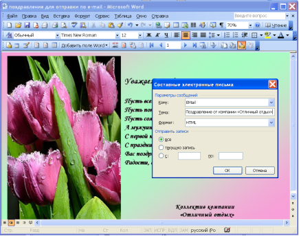 Рисунок 18 Пишем электронные письма Рассмотрим еще одну ситуацию: нужно подготовить поздравления и отправить их не через почтовое отделение связи, а с помощью электронной почты. При подготовке таких поздравлений желательно избегать общих обращений типа «Уважаемые женщины», «Дорогие коллеги» и не включать в строку «Кому» сразу всех адресатов. Ведь Вы согласитесь, что электронное поздравление приятнее получать, когда оно персональное, т.е. адресовано лично Вам. При подготовке электронных поздравлений функция «Слияние» тоже может сослужить вам добрую службу. При этом подготовка электронных поздравлений будет мало чем отличаться от создания поздравлений в виде писем или открыток на бумажном носителе. Основных отличий будет всего два: – Во-первых, при создании нового основного документа нужно будет выбрать тип «электронные письма», а не «обычный документ Word» (Рисунок 4). – А во-вторых, когда основной документ будет готов, нужно осуществить слияние не в новый документ, а нажать на пиктограмму «Слияние по электронной почте» ( – указать категорию данных (или столбец источника данных), который содержит адреса электронной почты, и – напечатать тему для электронных сообщений. В результате будут созданы электронные сообщения с поздравлениями (Рисунок 20). Их количество будет равняться числу строк, используемых при слиянии.