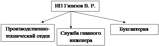Рисунок 1 - производственная структура ИП Газизов В. Р. В основное производство входит эксплуатация и строительство объектов газового хозяйства и оптовая и розничная торговля. Обслуживающее производство включает в себя техническое обслуживание газопроводов, планово-предупредительный ремонт объектов газового хозяйства, пусконаладочные работы на объектах газового хозяйства, технический осмотр и ремонт оборудования, транспортные услуги. Вспомогательное производство: проектирование газовых сетей, разработка и внедрение систем газового хозяйства. На исследуемом предприятии существует несколько уровней управления: высший - директор предприятия (в лице ИП Газизова В. Р.); низший - начальники производственных структур и отделов. В различных заместителях (средний уровень) организация не нуждается, так как предприятие не велико по своим масштабам, численность персонала составляет 10-15 человек, и руководить ими единолично директору не составляет особого труда (Рисунок 2).