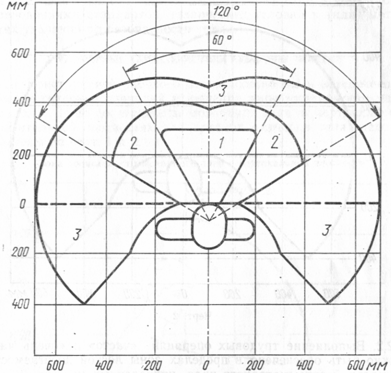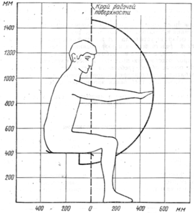Рисунок 2 – Зона досягаемости моторного поля в горизонтальной плоскости при высоте рабочей поверхности над полом 725 мм.[4] Выполнение частых трудовых операций должно быть обеспечено в пределах зоны легкой досягаемости и оптимальной зоны моторного поля, приведенных на рисунке 3.