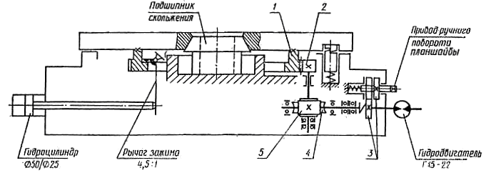 Стол предназначен для периодического перемещения обрабатываемых деталей из одной рабочей позиции на другую и точной фиксацией на каждой позиции. Подобные столы применяются для компоновки многопозиционных агрегатных станков. Класс точности Н. Гидрораспределители для подвода масла к приспособлению закрепляются на оси стола. Во время поворота планшайбы опорные направляющие гидростатически разгружаются маслом марки ИНСА-65 ТУ 38-101672-77, которое подается от станции смазки, расположенной рядом с поворотным столом. Масло, стекающее с направляющих во внутреннюю полость корпуса, используется для смазки зубчатой и червячной передач и попадает в клапан 15, откуда самотеком возвращается в станцию смазки. Планшайба 18 поворачивается гидродвигателем 3 через червячную передачу 6 и цилиндрическую зубчатую передачу 20. В конце поворота упop 8 наезжает на подвижный фиксатор 10, который при ходе вниз включает выключатель 14 и нажимает золотник 19, затормаживающий вращение гидродвигателя 3. При дальнейшем вращении планшайбы фиксатор освобождается, под действием пружины 11 поднимается вверх и размыкает выключатель 14, который дает команду на реверс гидродвигателя 3. Масло начинает поступать через нижнее отверстие золотника 19, и плунжер золотника, поднимаясь вверх, освобождает проход масла к гидродвигателю. Скорость реверса определяется стабилизатором, установленным на выходе гидродвигателя. В конце реверса упор 8 поворачивает валик 9, расположенный по оси фиксатора 10, преодолевая усилие пружины 18. На нижнем конце валика 9 находится планка с винтом 12, который при повороте валика включает датчик исходного положения 13. Срабатывание датчика включает реле времени (РВ), выдержка которого достаточна для создания необходимого усилия контакта фиксирующих плоскостей упора 8 и фиксатора 10. Срабатывание РВ отключает гидроразгрузку и включает зажим планшайбы. Зажим планшайбы и вместе с ним цикл деления заканчивается при срабатывании РВ. На столе имеется ручной привод поворота планшайбы, который используется при наладке стола. Он состоит из подпружиненной шестерни вала 4, на конце которой выполнено шестигранное отверстие под ключ, и шестерни 2, соединенной разгонной муфтой 1 с червяком 6. При сжатии пружины 5 шестерня 4 вводится в зацепление с шестерней 2. Корыто стола 7 предназначено для сбора стружки и охлаждающей жидкости, которые удаляются по лотку в отдельно стоящее приемное устройство. Для удобства демонтажа корыто выполнено разъемным. В оси 16 стола предусмотрено центральное отверстие для подвода труб гидравлики и смазки к приспособлению. Основные технические данные стола модели У1Н2056: