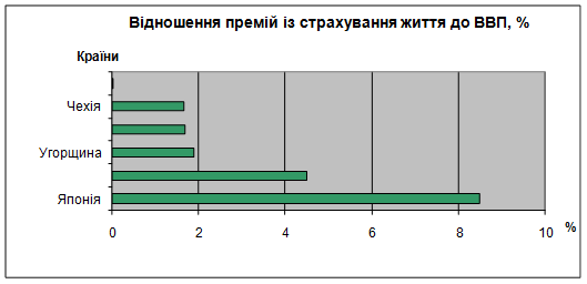 Зміст 1. Характеристика стану страхування життя в Україні на сучасному етапі 2. Тенденції розвитку страхування життя в Україні 3. Проблеми, що стримують розвиток страхування життя 4. Шляхи вирішення проблем ринку страхування життя 1. Характеристика стану страхування життя в Україні на сучасному етапі Формування ринку страхування життя має інституціональне значення в розвитку економіки. Виконуючи функцію накопичення грошових коштів, страхування життя акумулює внутрішні інвестиційні ресурси суспільства, і сприяє поліпшенню економічного стану країни. Загальновідомо, що у розвинутих країнах частка страхових компаній в інвестуванні економіки становить біля 30%. Таке значення страхування життя визначає необхідність розвитку цього ринку і в Україні. Існує пряма залежність між рівнем ВВП країни та долею зборів по страхуванню життя в ВВП. Український ринок реального страхування життя складає 0,07-0,08% від ВВП. За цим показником Україна багаторазово поступається не тільки країнам з найвищим у світі рівнем добробуту, але і своїм сусідам у Центральній та Східній Європі. Так, за даними 2008 року у Чехії, Угорщині та Польщі ринок страхування життя становив біля 1-2% від ВВП, у США – 4-5%, в Японії – 8-9% (рис.1)[6].
