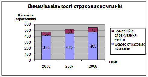 Рисунок 2 – Динаміка зміни кількості страховиків за 2006-2008 роки Основні чинники зростання ринку – приріст добробуту населення та збільшення його страхової культури. У загальному обсязі страхових премій частка премій зі страхування життя є невисокою і становить близько 4% (рис. 3, 4).