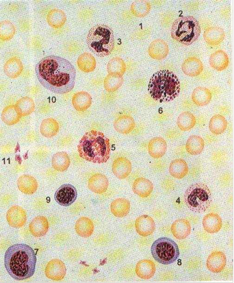 Рис 1. Форменные элементы крови человека в мазке. 1 - эритроцит, 2 - сегментоядерный нейтрофильный гранулоцит, 3 - палочкоядерный нейтрофильный гранулоцит, 4 - юный нейтрофильный гранулоцит, 5 - эозинофильный гранулоцит, 6 - базофильный гранулоцит, 7 - большой лимфоцит, 8 - средний лимфоцит, 9 - малый лимфоцит, 10 - моноцит, 11 - тромбоциты (кровяные пластинки). Свойства крови: 1. Относительная плотность крови - зависит от количества эритроцитов и белков. 2. Вязкость крови - обусловлена наличием в крови эритроцитов и в меньшей степени белков плазмы. 3. Осмотическое давление крови - сила, с которой растворитель переходит через полунепроницаемую мембрану из менее в более концентрированный раствор. Осмотическое давление крови вычисляют криоскопическим методом путем определения точки замерзания крови ( депрессии),которая для нее равна 0,56 - 0,58 С. Осмотическое давление крови в среднем составляет 7,6 атм. Оно обусловлено растворенными в ней осмотически активными веществами, главным образом неорганическими электролитами, в значительно меньшей степени - белками. Около 60% осмотического давления создается солями натрия (NаСl). Осмотическое давление определяет распределение воды между тканями и клетками. Растворы с более высоким осмотическим давлением, чем давление крови, называются гипертоническими, а имеющие более низкое давление - гипотоническими ( рис 2.)