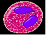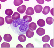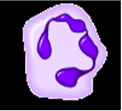 Рис.8. Моноцит. Цитоплазма моноцитов менее базофильна, чем цитоплазма лимфоцитов. При окраске по методу Романовского - Гимзы она имеет бледно-голубой цвет, но по периферии окрашивается несколько темнее, чем около ядра; в ней содержится различное количество очень мелких азурофильных зерен (лизосом). Характерны наличие пальцеобразных выростов цитоплазмы и образование фагоцитарных вакуолей. В цитоплазме расположено множество пиноцитозных везикул. Имеются короткие канальцы гранулярной эндоплазматической сети, а также небольшие по размеру митохондрии. Моноциты относятся к макрофагической системе организма, или к так называемой мононуклеарной фагоцитарной системе (МФС). Клетки этой системы характеризуются происхождением из промоноцитов костного мозга, способностью прикрепляться к поверхности стекла, активностью пиноцитоза и иммунного фагоцитоза, наличием на мембране рецепторов для иммуноглобулинов и комплемента. Моноциты циркулирующей крови представляют собой подвижный пул относительно незрелых клеток, находящихся на пути из костного мозга в ткани. Время пребывания моноцитов в крови варьирует от 36 до 104 ч. Моноциты, выселяющиеся в ткани, превращаются в макрофаги, при этом у них появляются большое количество лизосом, фагосом, фаголизосом. Из крови в ткани за 1 ч уходит 7,0-106 моноцитов. В тканях моноциты дифференцируются в органо - и тканеспецифичные макрофаги. Внесосудистый пул моноцитов в 25 раз превышает циркулирующий. Система мононуклеарных фагоцитов является центральной, объединяющей различные типы клеток, участвующих в защитных реакциях организма. Макрофагам принадлежит важнейшая роль в процессах фагоцитоза. Они удаляют из организма отмирающие клетки, остатки разрушенных клеток, денатурированный белок, бактерии и комплексы антиген-антитело. Макрофаги участвуют в регуляции кроветворения, иммунном ответе, гемостазе, метаболизме липидов и железа. Содержание моноцитов в крови в норме отражено в табл.2. Таблица 3. Содержание лимфоцитов (абсолютное и относительное - процентное количество) в крови в норме
