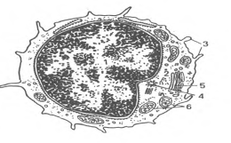 Рис.6. Ультрамикроскопическое строение лимфоцита (схема по Н.А. Юриной, Л.С. Румянцевой). I - ядро; 2 - рибосомы; 3 - микроворсинки; 4 - центриоль; 5 - аппарат Гольджи; 6 - митохондрии. Среди малых лимфоцитов различают светлые и темные. Малые темные лимфоциты меньше светлых, имеют более плотное ядро, более узкий ободок базофильной цитоплазмы, обладающей высокой электронной плотностью. В цитоплазме расположено большое количество рибосом. Средние лимфоциты составляют около 10-12 % лимфоцитов крови человека. Ядра этих клеток округлые, иногда бобовидные с пальцевидным впячиванием ядерной оболочки. Хроматин более рыхлый, ядрышко хорошо выражено. В цитоплазме расположены удлиненные канальцы гранулярной эндоплазматической сети, элементы агранулярной сети, свободные рибосомы и полисомы, лизосомы. Центросома и аппарат Гольджи расположены рядом с областью инвагинации кариолеммы. Кроме типичных лимфоцитов, в крови человека в небольшом количестве могут встречаться лимфоплазмоциты (около 1-2 %), которые отличаются концентрическим расположением вокруг ядра канальцев гранулярной эндоплазматической сети. Основной функцией лимфоцитов является участие в иммунных реакциях. Однако популяция лимфоцитов гетерогенна по характеристике поверхностных рецепторов и роли в реакциях иммунитета. Среди лимфоцитов различают три основных функциональных класса: В - лимфоциты, Т-лимфоциты и нулевые лимфоциты. В-лимфоциты впервые были обнаружены в фабрициевой сумке птиц (bursa Fabricius), поэтому и получили соответствующее название. Они образуются у эмбриона человека из стволовых клеток - в печени и костном мозге, а у взрослого - в костном мозге. В-лимфоциты составляют около 30 % циркулирующих лимфоцитов. Их главная функция - участие в выработке антител, т.е. обеспечение гуморального иммунитета. Плазмолемма В - лимфоцитов содержит множество иммуноглобулиновых рецепторов. При действии антигенов В-лимфоциты способны к пролиферации и дифференцировке в плазмоциты - клетки, способные синтезировать и секретировать защитные белки - иммуноглобулины (Ig), которые поступают в кровь, обеспечивая гуморальный иммунитет. Т-лимфоциты, или тимусзависимые лимфоциты, образуются из стволовых клеток костного мозга, а созревают в тимусе (вилочковая железа), что и обусловило их название. Они преобладают в популяции лимфоцитов, составляя около 70 % циркулирующих лимфоцитов. Для Т-клеток, в отличие от В-лимфоцитов, характерен низкий уровень поверхностных иммуноглобулиновых рецепторов в плазмолемме. Но Т-клетки имеют специфические рецепторы, способные распознавать и связывать антигены, участвовать в иммунных реакциях. Основными функциями Т-лимфоцитов являются обеспечение реакций клеточного иммунитета и регуляция гуморального иммунитета (стимуляция или подавление дифференцировки В-лимфоцитов). Т-лимфоциты способны к выработке лимфокинов, которые регулируют деятельность В-лимфоцитов и других клеток в иммунных реакциях. Среди Т-лимфоцитов выявлено несколько функциональных групп: Т-хелперы, Т-супрессоры, Т-киллеры. Т-хелперы (от англ. helper - помощник) - их главной функцией является усиление адаптивного иммунного ответа (рис.7). Активируют Т-киллеры, В-лимфоциты, моноциты, NK-клетки, презентируя им фрагменты чужеродного антигена при прямом контакте, а также гуморально, выделяя цитокины. Основны