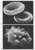 Рис.10. А. Нормальные эритроциты в форме двояковогнутого диска. Б. Сморщенные эритроциты в гипертоническом солевом растворе