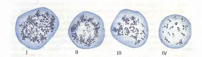 Рис.11. Изменение формы эритроцитов в процессе старения (схема). I, II, III, IV - стадии развития эхиноцитов и стоматоцитов (по Т. Фуджии). Размеры эритроцитов в нормальной крови также варьируют. Большинство эритроцитов (~ 75 %) имеют диаметр около 7,5 мкм и называются нормоцитами. Остальная часть эритроцитов представлена микроцитами (~ 12,5 %) и макроцитами ( - 12,5 %). Микроциты имеют диаметр <7,5 мкм, а макроциты >7,5 мкм. Изменение размеров эритроцитов встречается при заболеваниях крови и называется анизоцитозом.