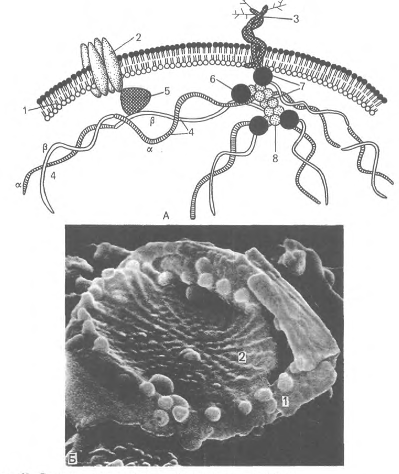Рис.14. Строение плазмолеммы и цитоскелета эритроцита. А - схема: 1 - плазмолемма; 2 - белок полосы 3; 3 - гликофорин; 4 - сттектрин {а - и р - цепи); 5 - анкирин; 6 - белок полосы 4.1; 7 - узловой комплекс; 8 - актин; Б - плазмолемма и цитоскелет эритроцита в сканирующем электронном микроскопе. - плазмолемма: 2 - сеть спектрина. Олигосахариды гликолипидов и гликопротеидов образуют гликокаликс. Они определяют антигенный состав эритроцитов, т.е. наличие в них агглютиногенов. На поверхности эритроцитов выявлены агглютиногены А и В, в состав которых входят полисахариды, содержащие амнносахара и глюкуроновую кислоту. Они обеспечивают агглютинацию (склеивание) эритроцитов под влиянием соответствующих белков плазмы крови - а - и р-агглютининов, находящихся в составе фракции у-глобулинов. По содержанию агглютиногенов и агглютининов различают 4 группы крови: в крови А (0) группы отсутствуют агглютиногсны А и В, но имеются а - и р-агтлютинины; в крови А (П) группы имеются агглютиноген А и р-агглютинин; в крови В (Ш) группы содержатся В-агглютиноген и а-агглютинин; в крови AB (IV) группы имеются агглютиногены А и В и нет агглютининов. При переливании крови для предотвращения гемолиза (разрушение эритроцитов) нельзя допускать вливания реципиентам эритроцитов с агглютиногенами А или В, имеющим а - или р-агглютинины. Поэтому лица с (0) A группой крови являются универсальными донорами, т.е. их кровь может быть перелита всем людям с другими группами крови. Соответственно лица с AB (FV) группой крови являются универсальными реципиентами, т.е. им можно перелить любую группу крови. На поверхности эритроцитов имеется также резус-фактор (Rh-фактор) - агглютиноген. Он присутствует у 86 % людей; у 14 % отсутствует (резус-отрицательные). Переливание резус-положительной крови резус-отрицательному пациенту вызывает образование резус-антител и гемолиз эритроцитов. Агглютинация эритроцитов свойственна нормальной свежей крови, при этом образуются так называемые "монетные столбики". Это явление связано с потерей заряда плаэмолеммы эритроцитов. Скорость оседания (агглютинации) эритроцитов (СОЭ) в 1 ч у здорового человека составляет 4-8 мм у мужчин и 7-10 мм у женщин. СОЭ может значительно изменяться при заболеваниях, например при воспалительных процессах, и поэтому служит важным диагностическим признаком. В движущейся крови эритроциты отталкиваются из-за наличия на их плазмолемме одноименных отрицательных зарядов. Поверхность плазмолеммы одного эритроцита составляет около 130 мкм2 крови. При окрашивании мазка крови азур И-эозином по Романовскому - Гимзе большинство эритроцитов приобретают оранжево-розовый цвет (оксифильны), что обусловлено высоким содержанием в них гемоглобина. В небольшой части эритроцитов A-5 %), являющихся более молодыми формами, сохраняются остатки органелл (рибосомы, гранулярный, эндоплазматический ретикулум), которые проявляют базофилию. Такие эритроциты окрашиваются как кислыми красителями (эозин), так и основными (азур II) и называются полихроматофилъными. При специальной суправитальной окраске (бриллиант-крезилфиолетовым) в них выявляются зернисто-нитчатые структуры, поэтому их называют ретикулоцитами. Эритроциты различаются по степени насыщенности гемоглобином. Среди них выделяются нормохромные, гипохромные и гиперхромные, соотношение между которыми значитель